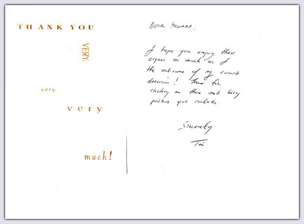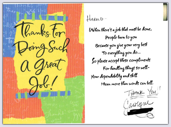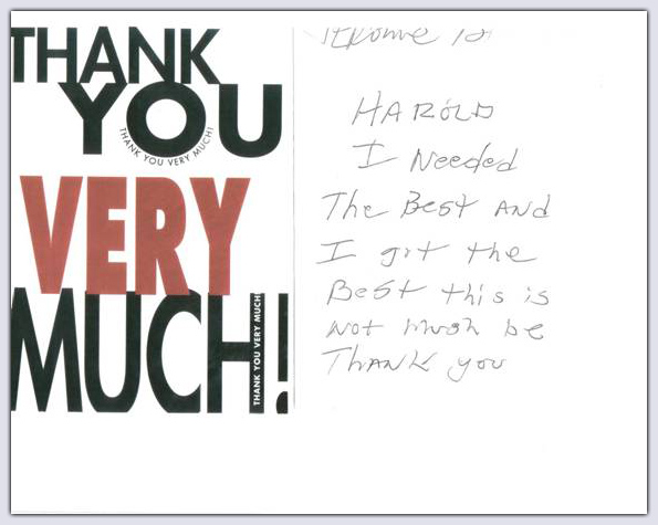 Mr. M. sent this Thank You card after Harold Wallin obtained a dismissal of his case by convincing a Cook County judge that the Chicago police officer that made the arrest had improperly stopped and detained Mr. M. without sufficient reasonable suspicion.