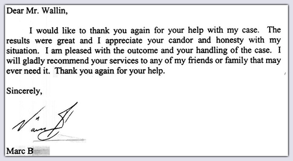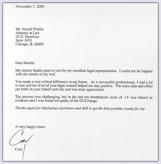 Marc sent this thank you letter after Harold Wallin was able to get his three year statutory summary suspension rescinded and his DUI case dismissed.
