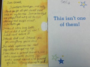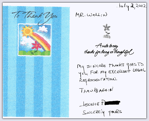 Client Jennie P. sent Harold L. Wallin this thank you after she was found “Not Guilty” of Driving While Intoxicated. Read about her case here.